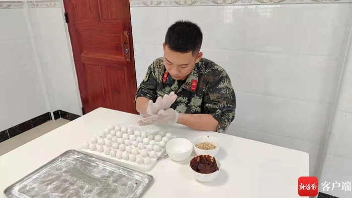 2月15日一大早,海警执法员小羊就把锅碗瓢盆洗干净,拿出提前准备好的糯米粉、豆沙、芝麻,然后用开水和面,搓、捏、按……一块块白色的糯米面团在他手中搓成一个个雪白圆球,将中间按压后塞入馅料,一粒粒汤圆就做好了。