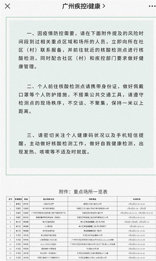 当日下午,广州疾控中心公布了10余个重点场所,呼吁在风险时间段到过相关重点区域和场所的人员,立即向所在社区(村)联系报备,并前往就近的核酸检测点进行核酸检测,同时配合社区(村)和疾控部门要求做好健康管理。公布的重点场所中,包括太古汇商场的两个店铺、长隆欢乐世界以及多个酒店。
