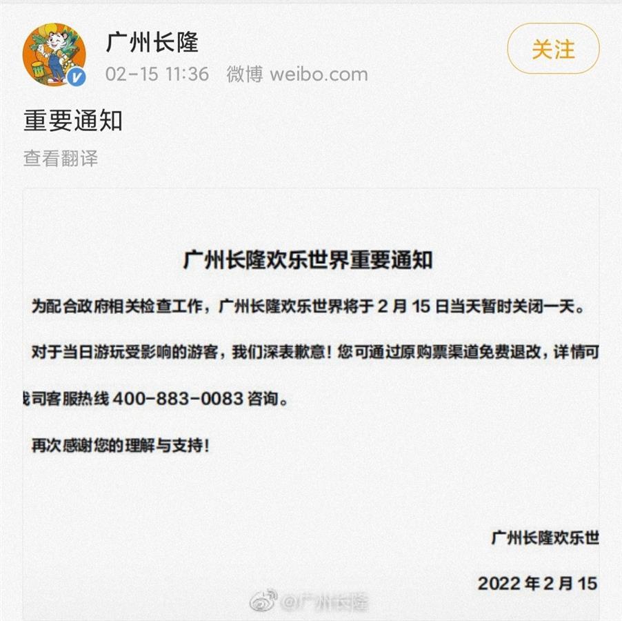 除太古汇商场外,广州长隆欢乐世界也发布通知称,为配合政府相关检查工作,15日暂时关闭一天。