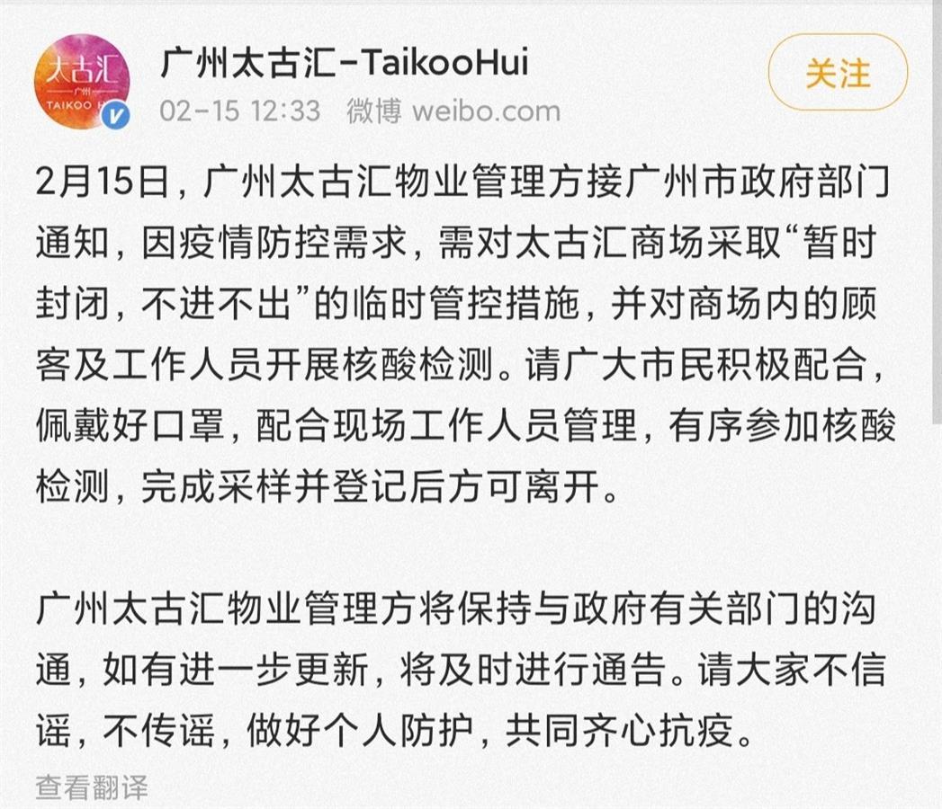 15日中午12时许,广州太古汇官方微博发布通知称,接广州市政府部门通知,因疫情防控需求,太古汇商场采取“暂时封闭,不进不出”的临时管控措施,并对商场内的顾客及工作人员开展核酸检测,完成采样并登记后方可离开。