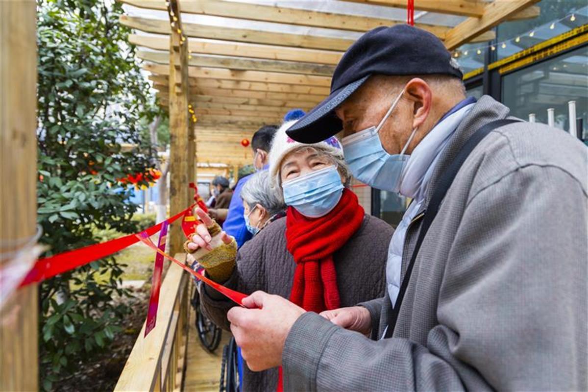 长廊区悬挂的200多个灯谜,吸引了老人们的注意力。谜面涵盖了字谜、成语、祝福词等多个方面,所有参与者猜出灯谜后可获得一张传统文化体验券,每张体验券可以在该区域其他展位兑换一项服务。