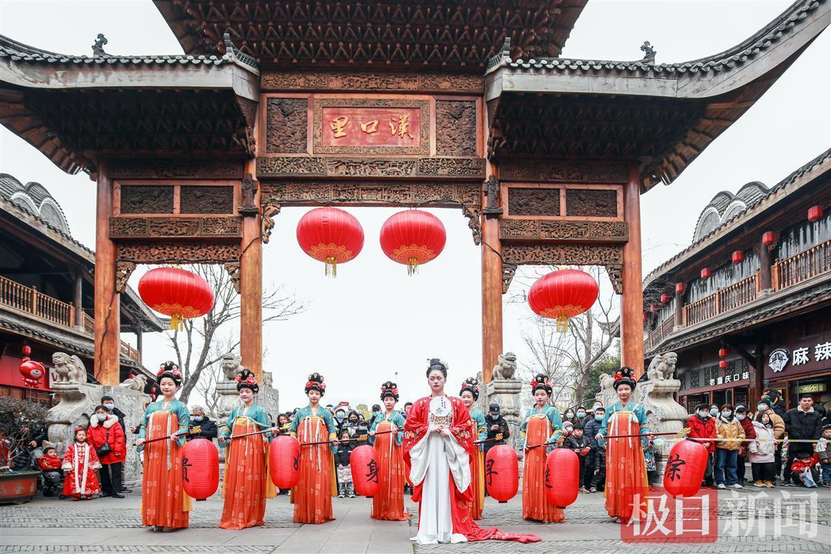 下午,园方又安排了两场唐朝舞蹈、杂耍等穿越项目,节目滚动表演,传递热闹喜庆,园区内主干道上,人流如潮。