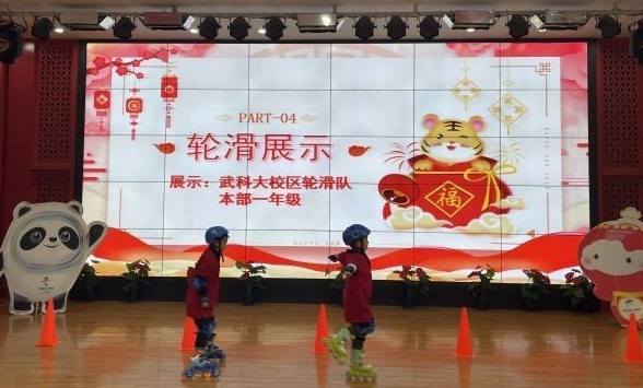 北京冬奥点燃了孩子们对奥运精神的追求,也点燃了他们对冰雪项目的热爱。“北京是全球唯一一座‘双奥’之城。”“‘冰丝带’的冰面被誉为‘最快的冰’。” “炫彩冬奥”知识竞赛让学生了解了冬奥会的许多小知识。武科大校区轮滑队的队员们将自己对冰雪项目的向往融入轮滑表演中,德智体美劳,“五育”齐并举,携手向未来。