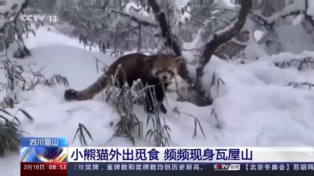 近日,受降雪天气的影响,在四川省眉山市洪雅县瓦屋山国家森林公园,国家二级保护动物小熊猫外出觅食,频频出没。工作人员和游客近距离拍摄到它们散步、觅食、嬉戏打闹的画面。