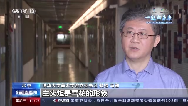 清华大学美术学院党委书记 教授 马赛:主火炬是雪花的形象,那么就我们说冰雪,雪的元素有了,冰的元素怎么体现?我们底下平面用的这种镜面不锈钢那种方式,相当于是冰的这样一个元素,雪花有点像冰上芭蕾,它在一个冰面上旋转跳舞的这种感觉。