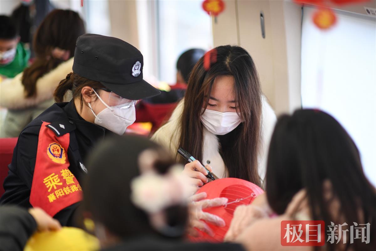 在本次旅程中,武汉铁路公安局襄阳公安处民警联合中国铁路武汉局集团公司襄阳客运段工作人员,通过开展猜灯谜、冬奥知识问答、列车“冰球比赛”以及防诈防盗宣传、安全小提示等多个互动节目,让旅客们在列车上度过了一个欢乐活力的元宵节。活动中,列车工作人员还为旅客们发放灯笼,邀请大家绘下自己的美好祝愿和新年展望。精彩的节目,引得现场旅客们的阵阵欢呼,大家怀抱着自己的“战利品”合影留念,记录下这美好时刻。