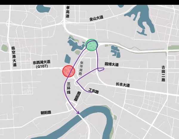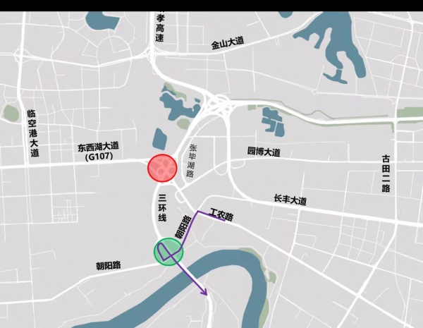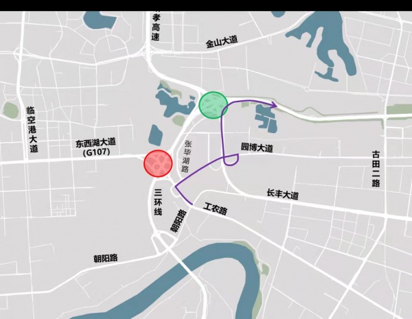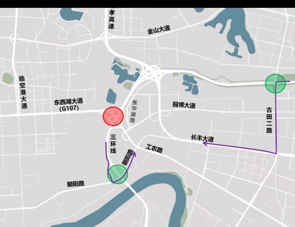 工农路往长丰桥方向建议绕行朝阳路、三环线。