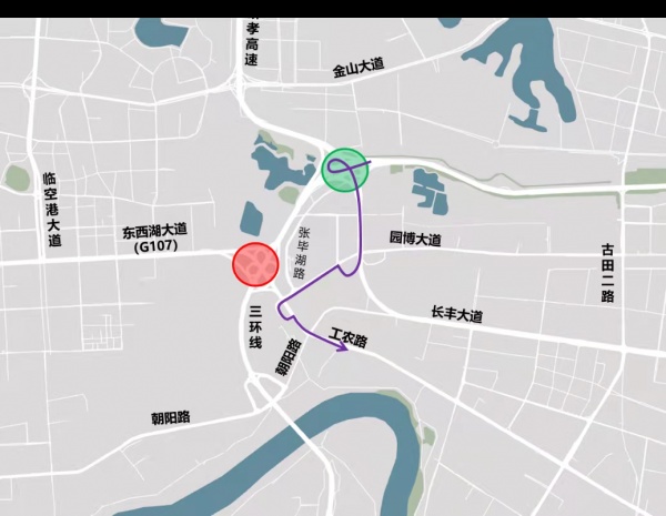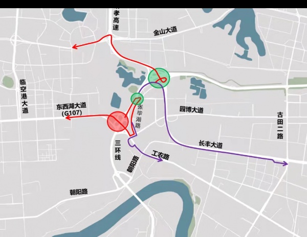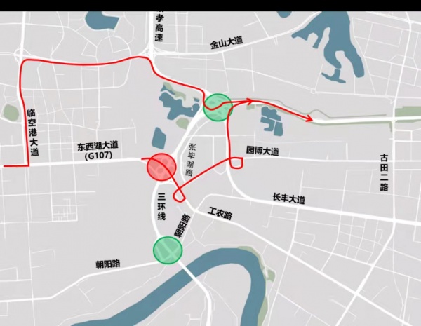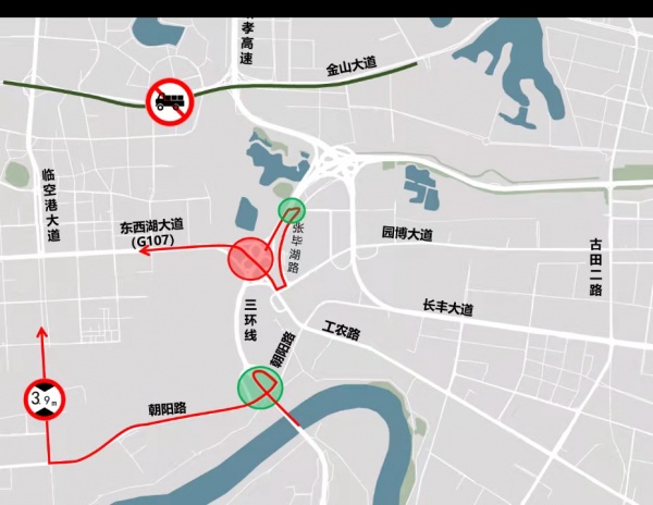 长丰桥往G107、工农路方向建议绕行张毕湖路、园博大道、工农路,或绕行硚孝高速、金山大道。