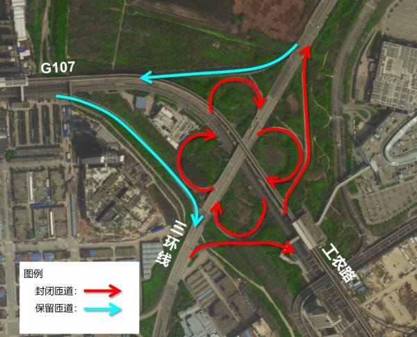 据介绍,施工期间额头湾立交有6条匝道封闭,分别为额头湾立交B匝道(三环线北往工农路方向),B1匝道(长丰桥往工农路方向)、B2匝道(工农路往三环线北方向)、E匝道(长丰桥往G107方向)、F匝道(G107往三环线北方向)、H匝道(工农路往长丰桥方向)禁止机动车通行。
