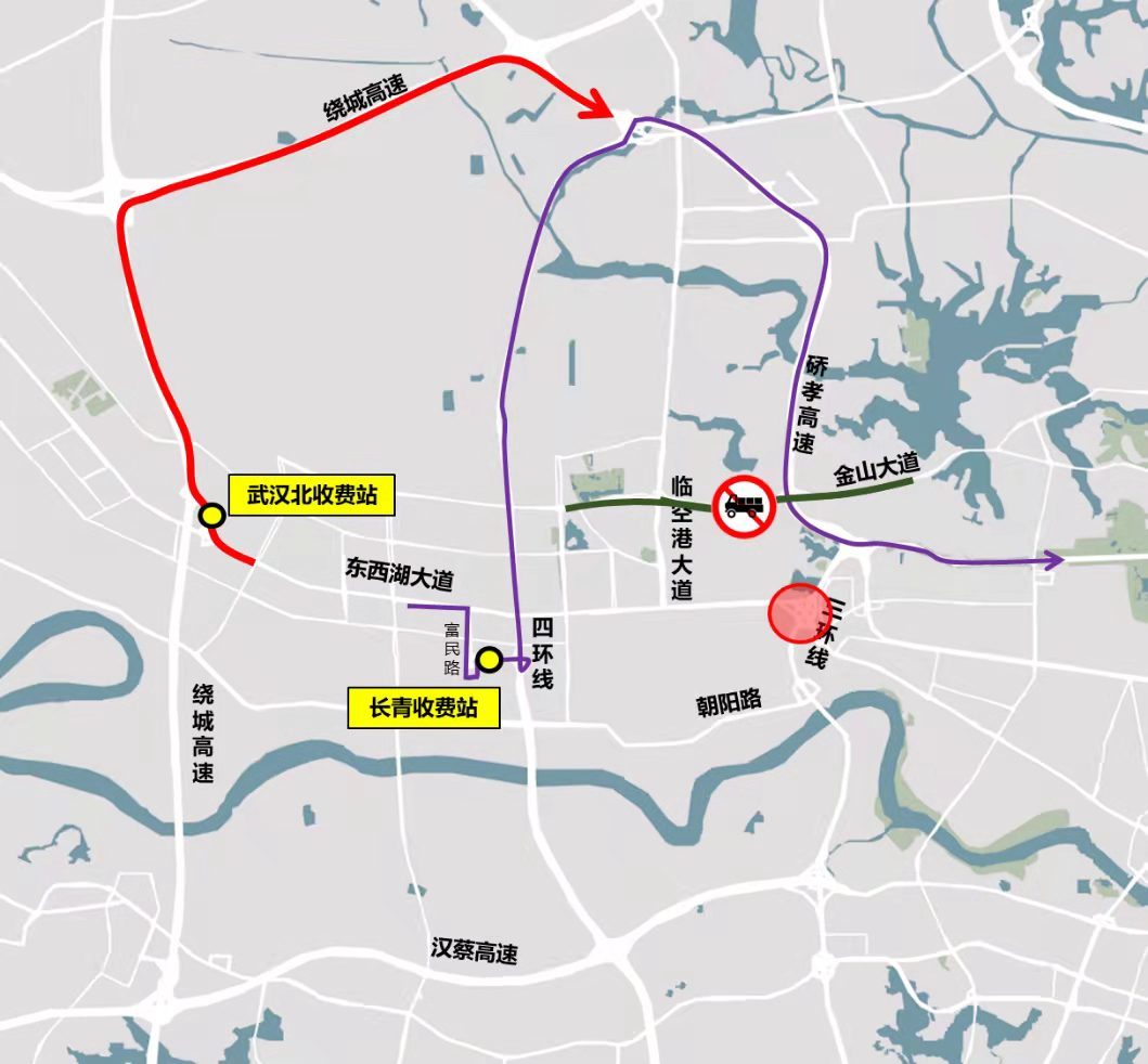 绕行线路1:琴台大道、汉蔡高速、四环线经长青收费站、富民路回G107。