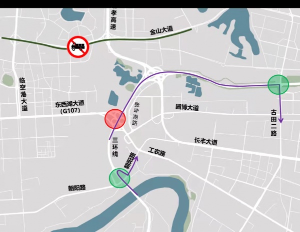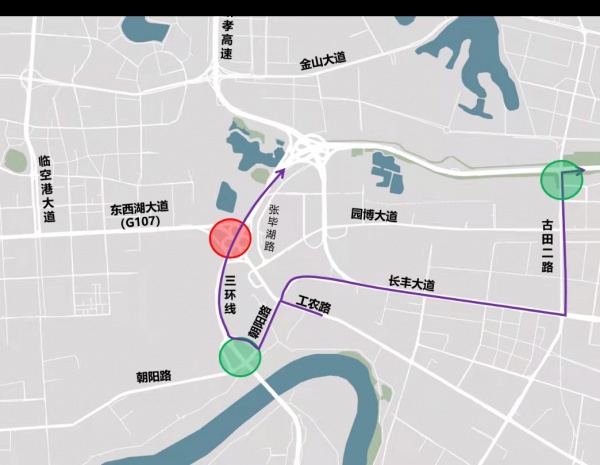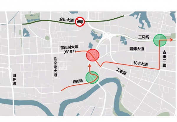 或绕行朝阳路、三环线,或绕行工农路、长丰大道、古田二路、三环线。