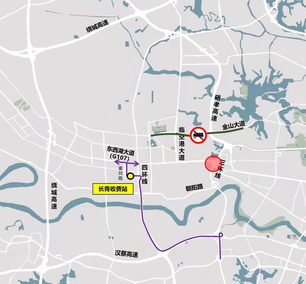 G107往三环线北方向建议绕行富民路、长青收费站、四环形、硚孝高速,或绕行武汉北收费站、绕城高速、硚孝高速。