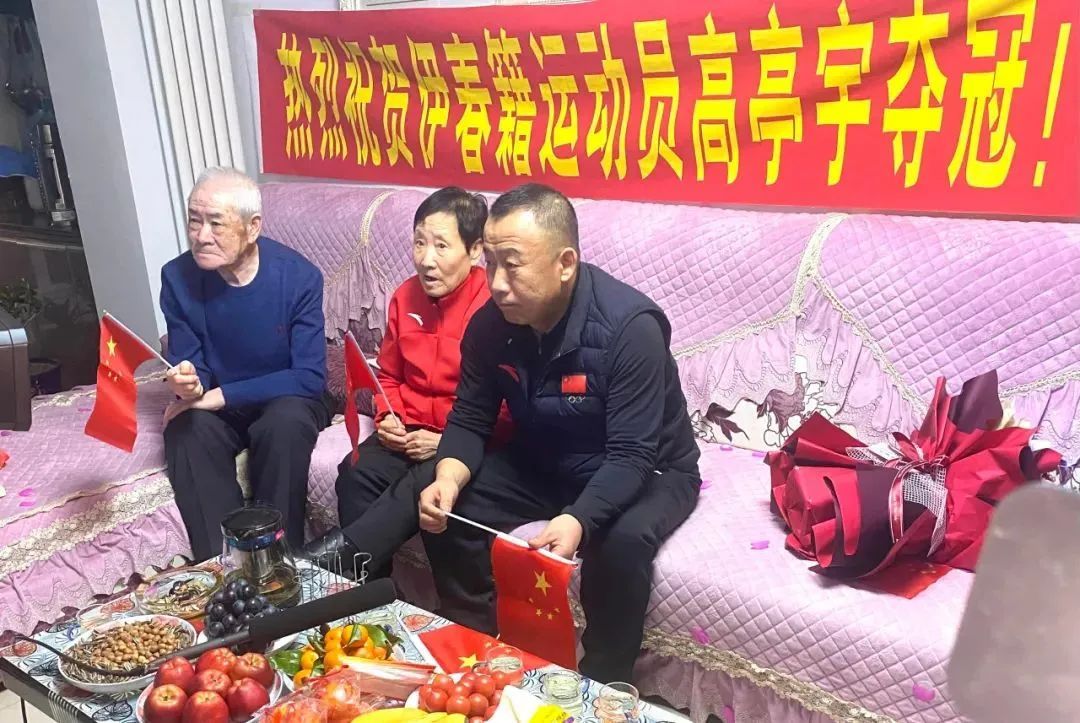 赛后,家人兴奋地祝贺高亭宇夺冠