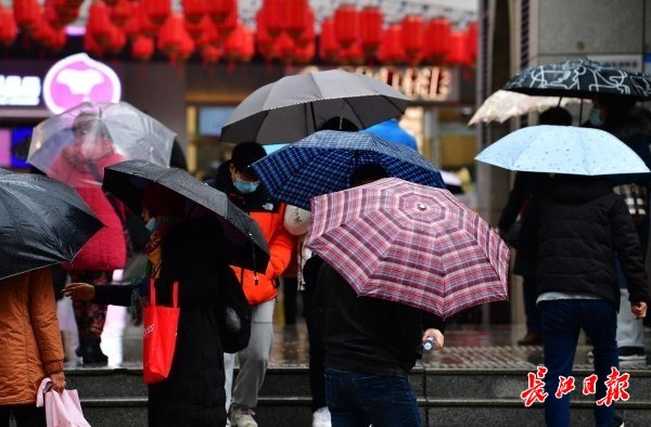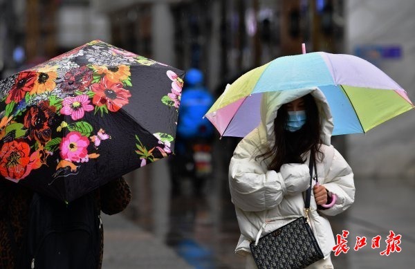 17日晨间,武汉普降小雨,最高气温就曾一度降至4℃。江汉路步行街上,路人裹着棉衣脚步匆匆。 记者李永刚 摄