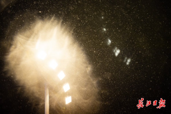 2月17日18时30分许,武汉城区飘起雨夹雪,雪花在路灯下尤为明显。 记者任勇 摄