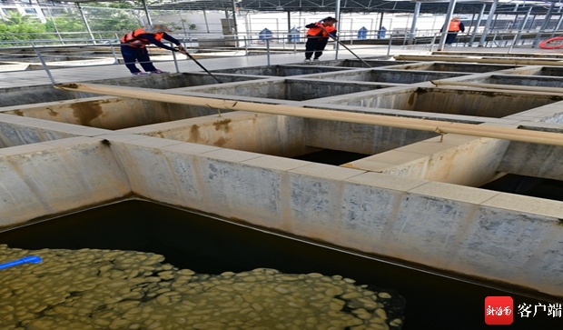 万宁自来水厂,工人捞起水面上的漂浮物。记者 陈卫东摄