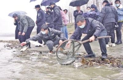 2月17日上午,在汉江蔡甸流域海事码头,300公斤活鱼被放流用于修复生态。