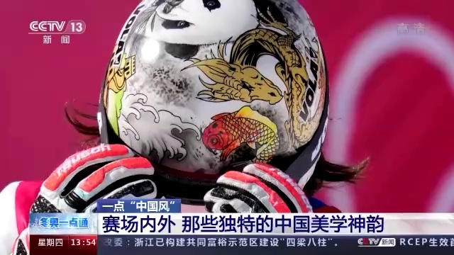 选手比赛,头盔出圈。冬奥会高山滑雪男子速降比赛现场,法国选手马蒂厄·贝莱的中国风头盔,汇集了锦鲤、熊猫、中国龙等多种中国元素。