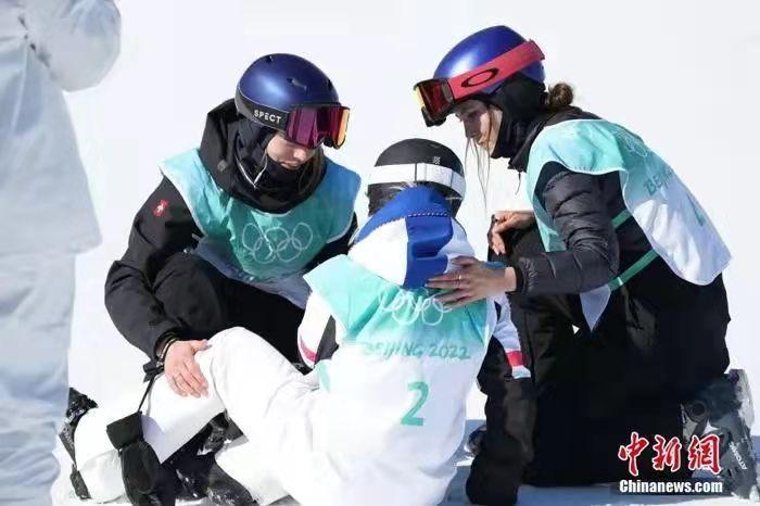 谷爱凌(右)同其他运动员相互扶助。中新社记者 毛建军 摄