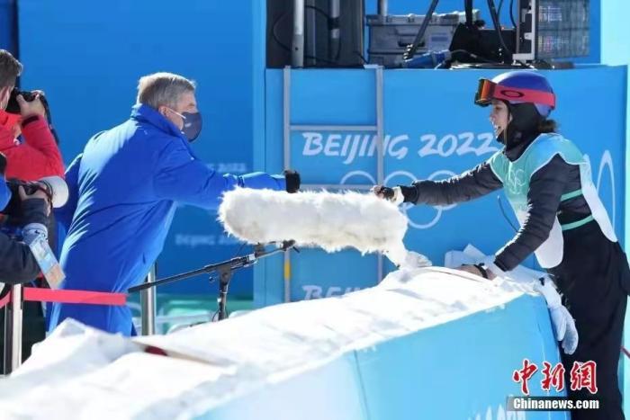 2月8日,国际奥委会主席巴赫(左)向谷爱凌表达祝贺。中新社记者 毛建军 摄