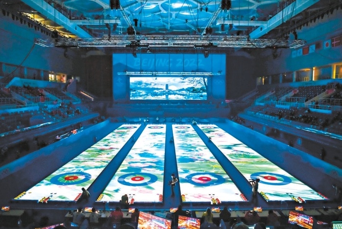 在冬奥冰壶赛场“冰立方”,比赛前大屏幕和冰面投影结合播放古塔、明月、荷塘等中国风画面,展示中国传统文化。 记者 邓伟摄