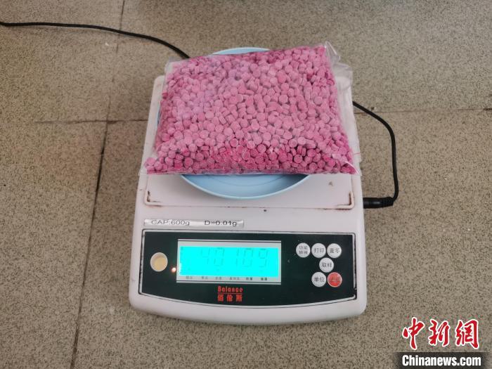巡逻组对该物品进行消杀后做进一步检查,物品包裹非常严实,黑色包装内部又层层包裹了白色胶带,当拆开最后一层蓝色包装后粉红色颗粒物出现在民警眼前。根据经验,民警初步判断为片剂甲基苯丙胺,俗称冰毒,经称重,净重为401.09克。
