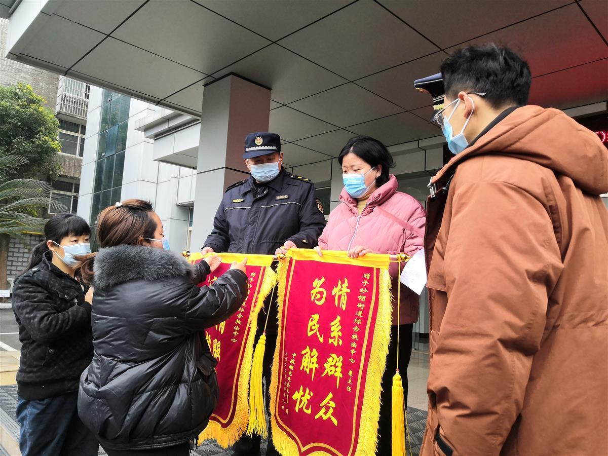 2月18日上午9时,中航锂电处商贩代表将写着“热情服务,公正执法”“情系群众,为民解忧”的锦旗和感谢信送至武汉经开区纱帽街道综合执法中心,表达他们与中航锂电处35家商贩对综合执法中心为民服务的感激之情。