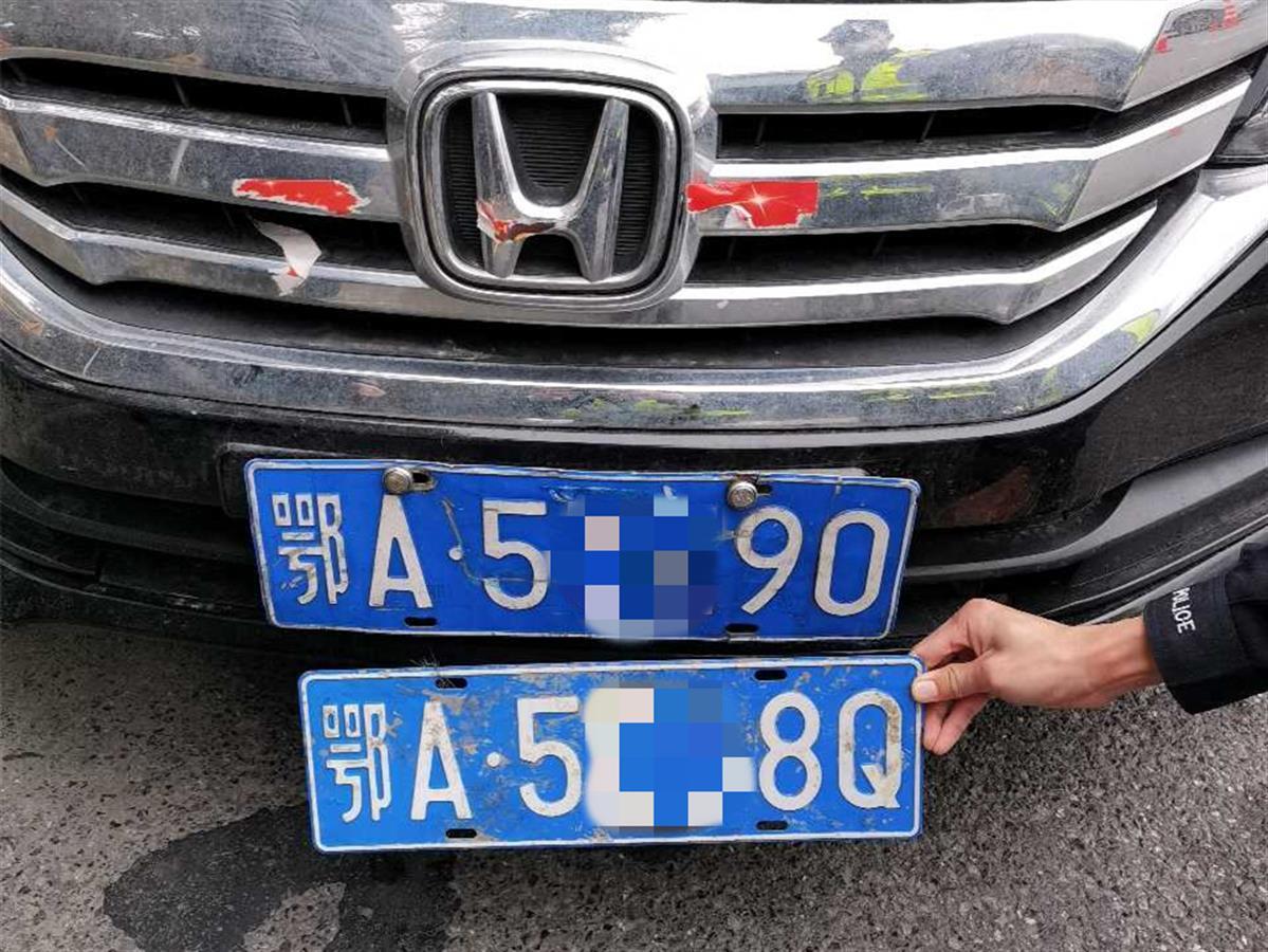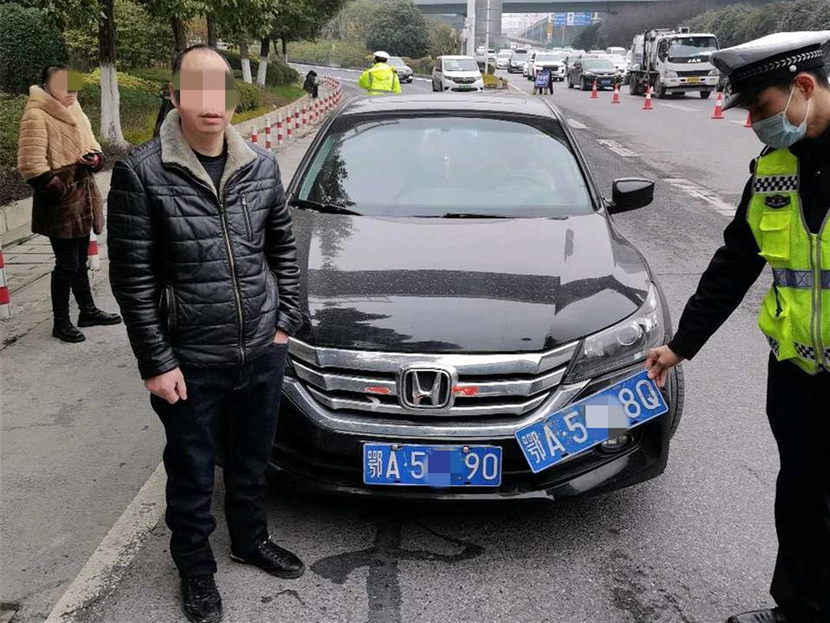 2月16日上午11时许,在欢乐大道检查点,川流不息的车流中,民警孙升发现一辆黑色轿车的前牌存在异常,定睛一看,该车前面居然挂着两块车牌,靠外的车牌一侧已脱落,露出了藏在后面的另一块车牌,随即将该车拦下进行检查。民警检查发现两块车牌不一样,一个车牌号为鄂A5***8Q,另一个为鄂A5***90,而露在外面的鄂A5***8Q号牌仅用一根铁丝挂着,可轻松挂上或取下。通过警务信息平台查询,显示鄂A5***90才是该车的真实号牌。