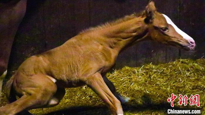 刚出生的小马驹跌跌撞撞好几回,但在产房工作人员的帮助下,终于在出生12分钟后,慢慢站立并晃着身子走动。