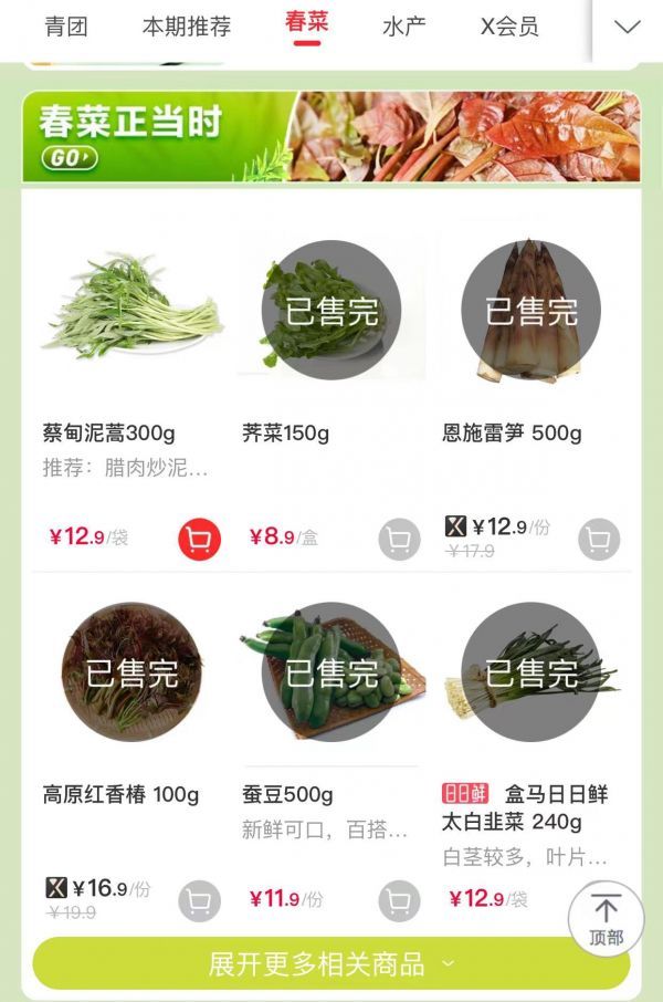 2月18日、19日连续两天的下午5时买菜晚高峰,长江日报记者在盒马武汉多家门店看到多个春菜新品售罄。其中,18日下午5时50分,记者在盒马武汉岳家嘴门店看到,十多个春菜新品卖到只剩蔡甸泥蒿一种了。