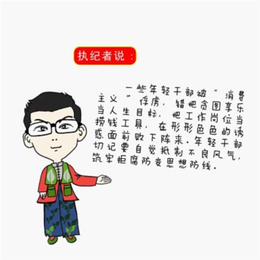 省纪委监委廉政漫画中的卡通人物“执纪者”说:一些年轻干部被“消费主义”俘虏,错把贪图享乐当人生目标,把工作岗位当捞钱工具,在形形色色的诱惑面前败下阵来。年轻干部切记要自觉抵制不良风气,筑牢拒腐防变思想防线。