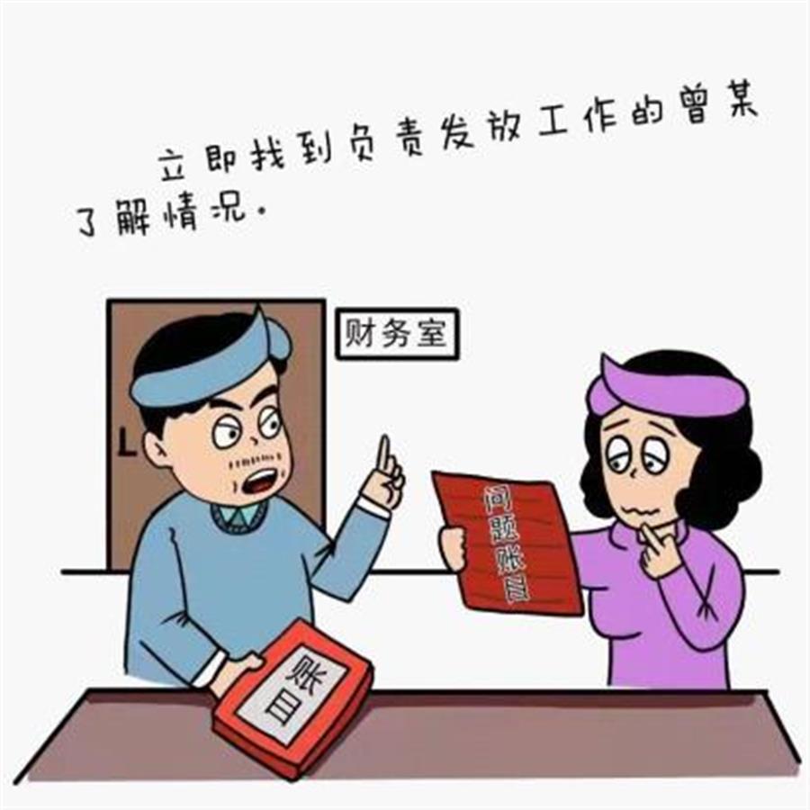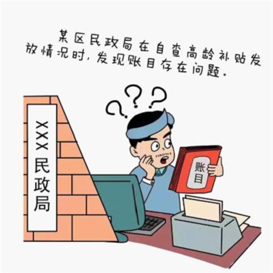 该廉政漫画讲述:某区民政局在自查高龄补贴发放情况时,发现账目存在问题,立即找到负责发放工作的曾某了解情况。