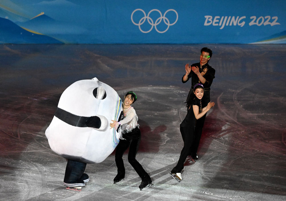 ↑2月20日,日本选手羽生结弦(左二)在表演滑结束后拥抱“冰墩墩”。新华社记者 马宁 摄