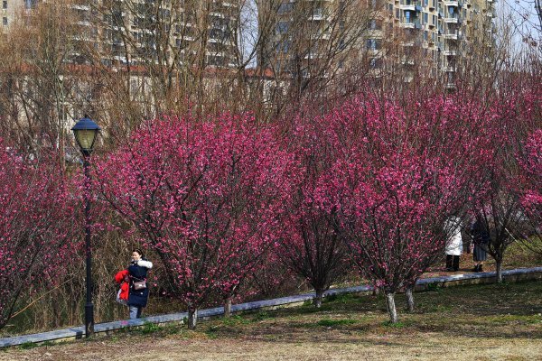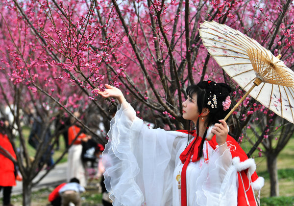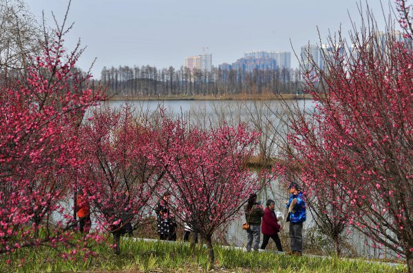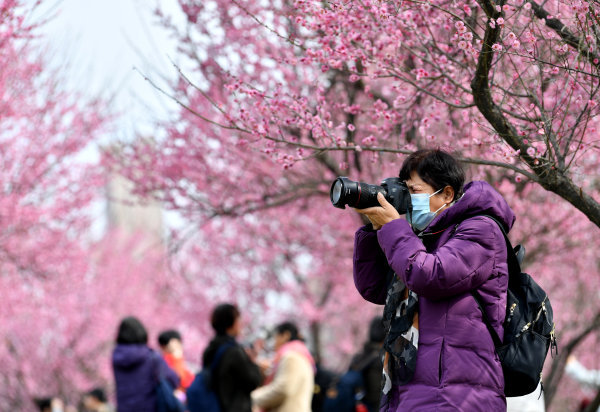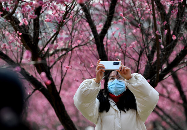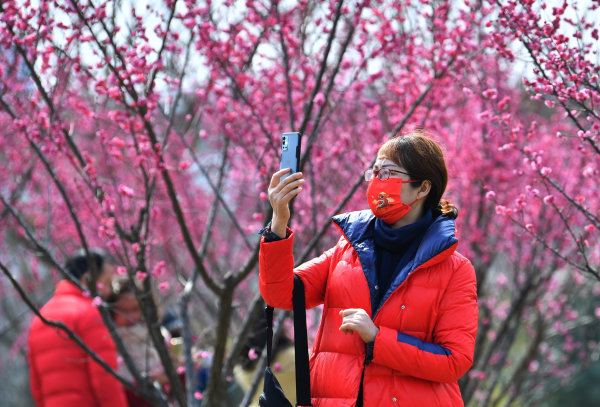 硚口区竹叶海公园梅林,不少市民趁着阳光正好,徜徉在梅花丛中赏景拍照。