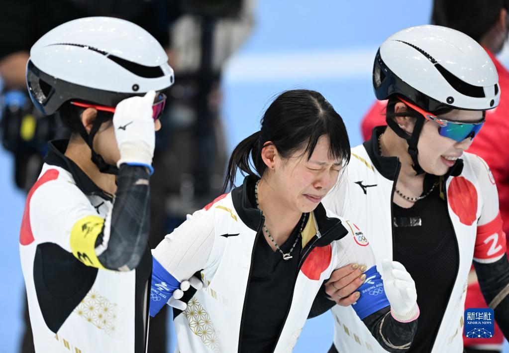 2月15日,出现失误的日本选手高木菜那在速度滑冰女子团体追逐决赛赛后哭泣。新华社记者武巍摄