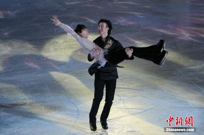 2月20日,北京2022年冬奥会花样滑冰表演滑在首都体育馆举行。图为中国队选手柳鑫宇(右)在表演滑结束后抱起日本选手羽生结弦。 中新社记者 毛建军 摄