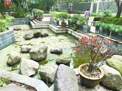 16日下午,本报记者来到江岸区台北沁园小区,在小区中央花园西侧有一个景观水池,木质栈桥、景观石、盆景点缀其中。但池内没有水,只有干枯树叶。小区居民邓先生透露,小区售房时,这个水池曾是不少业主看中的卖点。大约4年前,物业就抽干了池水。