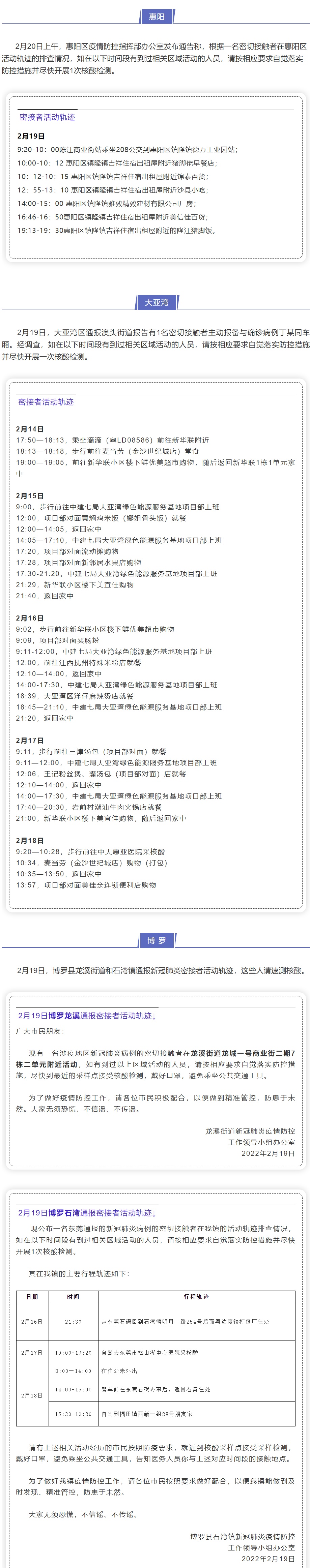 据“惠州发布”微信公众号消息,2月19日—20日,广东惠州惠阳区、大亚湾区和博罗县公布密接者活动轨迹,曾在相关区域活动人员请尽快测核酸!