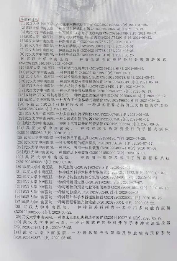 武汉大学中南医院神经外科护士李洁莉,通过在日常护理工作中获取灵感,近3年来已经拿到60个专利。近日,中南医院举行2021年度表彰大会,她获颁“知识产权奖”。