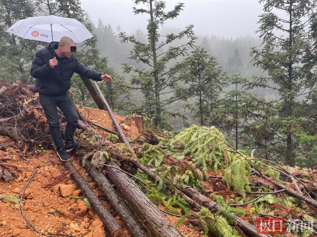 2月21日,记者跟随张先生重返事发现场。半年多过去,周围环境发生了很大变化,还堆放了许多被砍伐后杉木,但当时掩埋张加滇的坑洞仍依稀可见。