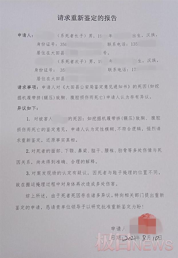 张加滇的遗体找到后曾进行尸检,大田县公安局出具的《鉴定意见通知书》显示,“死者符合较大的机械性暴力作用(如挖掘机履带挤(碾)压)致胸、腹腔损伤而死亡。”但张先生认为找到张加滇遗体时并没有看到被履带碾压的伤痕,故他申请重新鉴定,但未被采纳。