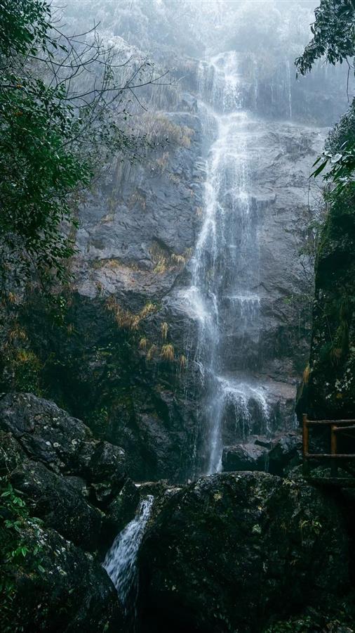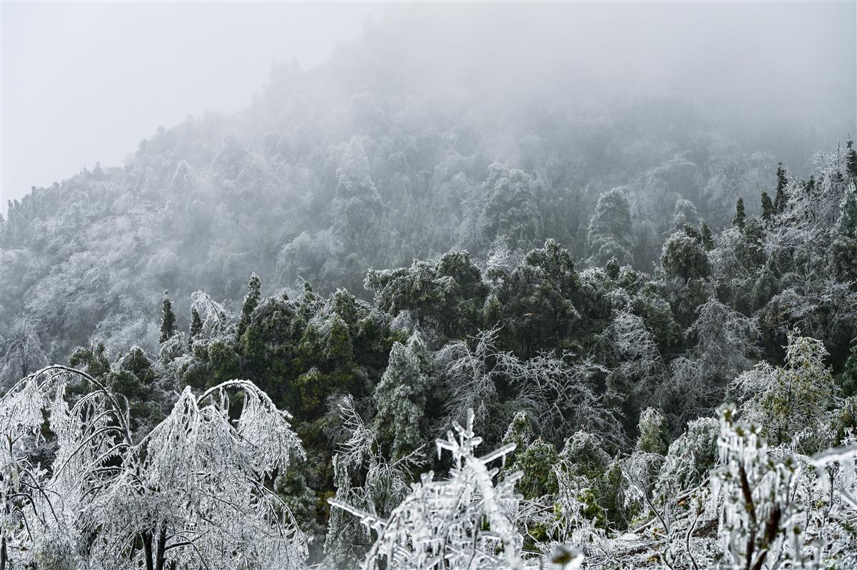 除了冰挂,山上覆盖了洁白雾凇的松树林频频让马宝杰举起摄像机。下午时分,山雾随风雨而至,在林间穿行,远远望去,如同仙境一般。