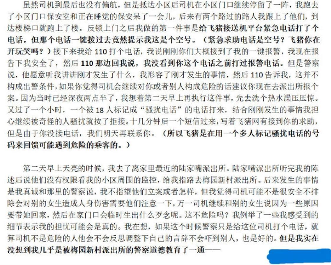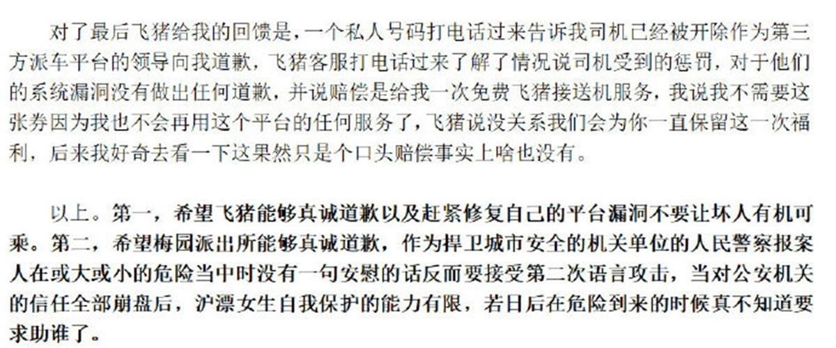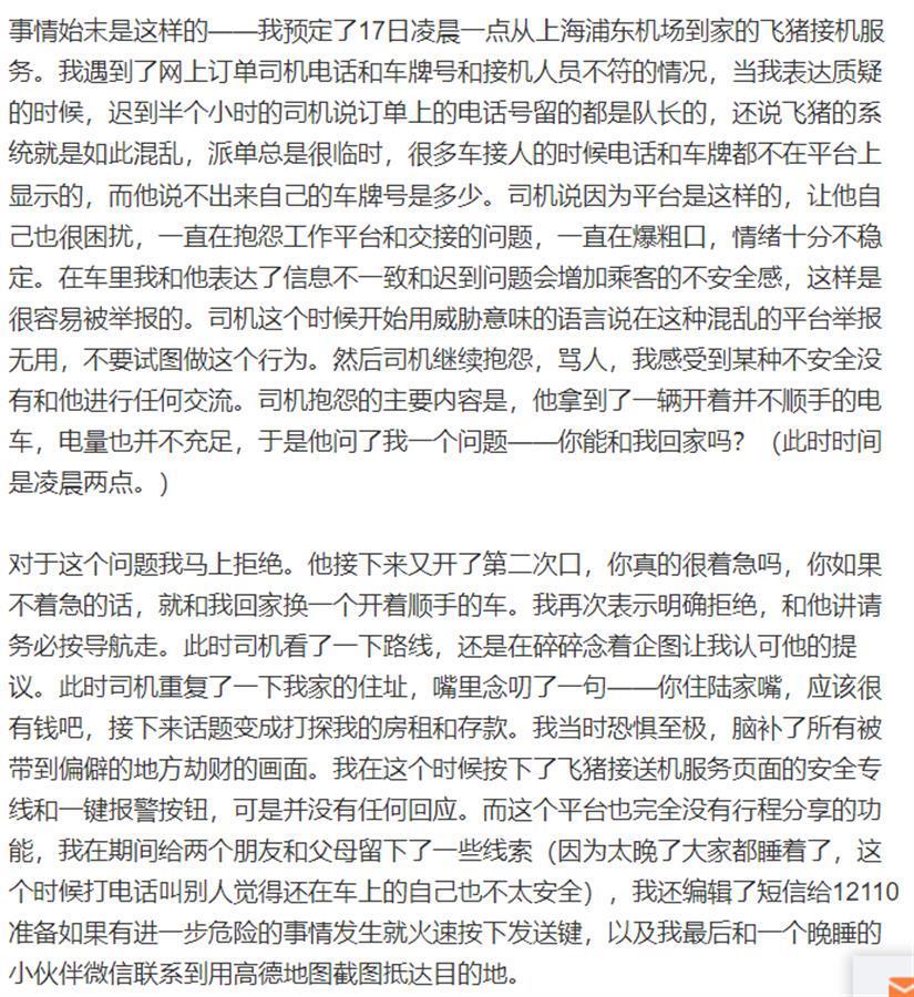 2月21日,家住上海的刘女士(化姓)发微博称,17日凌晨,自己在乘坐飞猪接机车辆时,遇到网上订单司机的电话、车牌号和实际接机人员不符的情况。在乘车过程中,司机情绪暴躁,并询问刘女士能否跟他回家换辆车再继续服务。被拒绝后,司机将她送到了目的地。次日,刘女士到当地派出所进行了笔录。