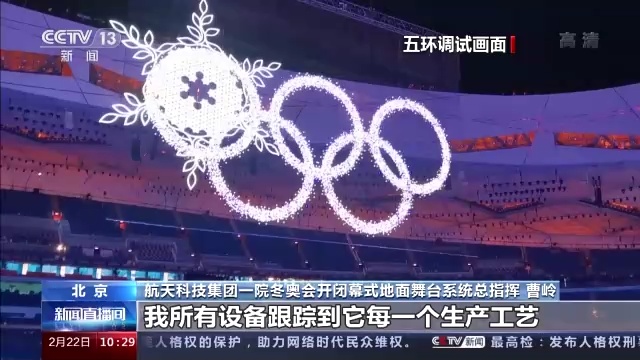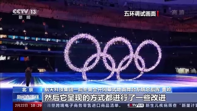 航天科技集团一院冬奥会开闭幕式地面舞台系统总指挥 曹岭:“梦幻五环”虽然是延续了2008年奥运会的设计思路,但是从2008年到现在已经14年了,技术已经提高了好多代。根据导演的一些需求,我们又增加了一些功能,比方说亮度的调节,比方说它整个从地面托起的感觉,然后它呈现的方式都进行了一些改进。