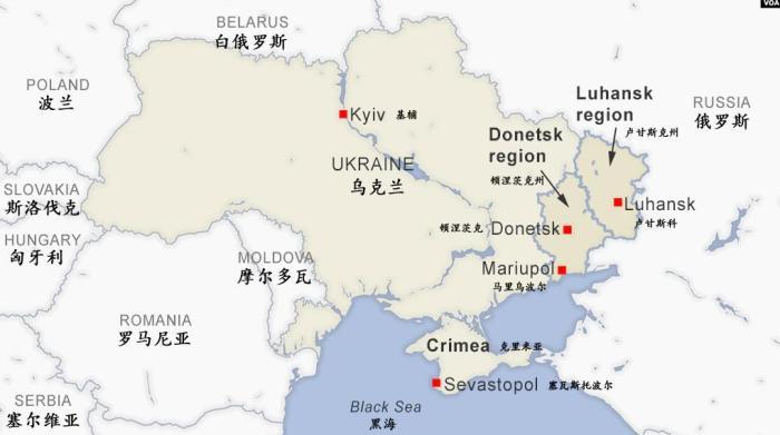 顿涅茨克和卢甘斯克合称顿巴斯,位于乌克兰东部,靠近俄罗斯边界。当地主要产业为煤矿和钢铁生产。