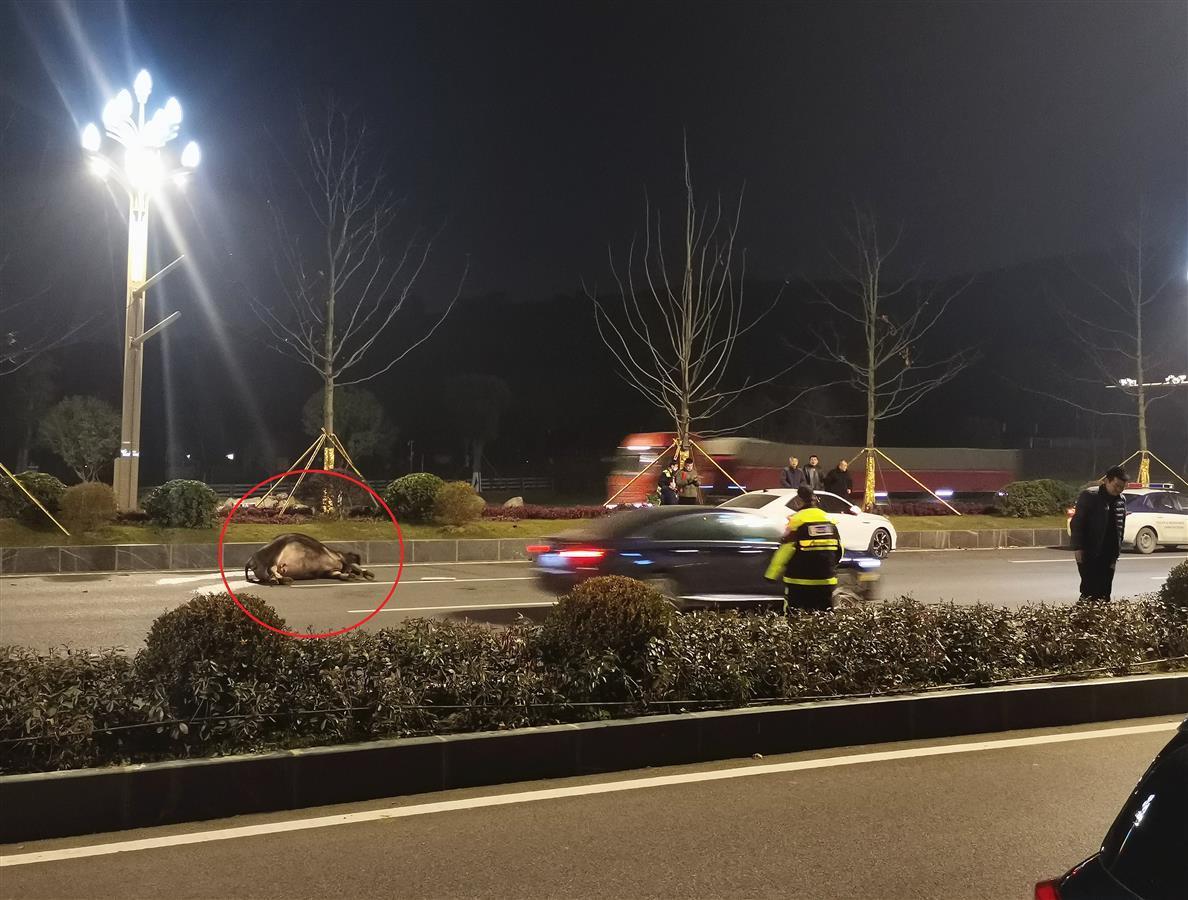 当晚8时许,武汉市民陈先生驾车经过高新大道时,看到两头水牛一大一小躺在事发路面。“奇怪了,怎么会有水牛呢?”陈先生向极目新闻热线(027-86777777)爆料,并将行车记录仪视频发给了本报。