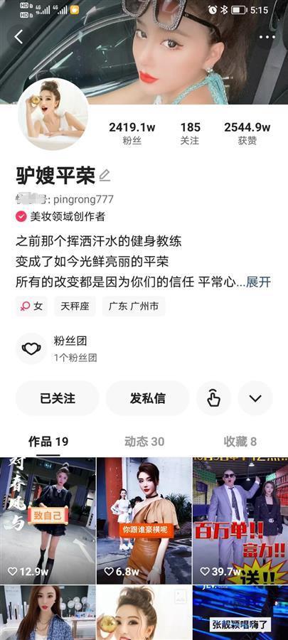 极目新闻记者查询发现,驴嫂平荣为某平台的美妆领域网红主播,账号粉丝高达2419.1万人,坐拥粉丝团成员150多万人,且加入其粉丝团需缴纳6.6元。公开资料显示,2021年5月,“驴嫂平荣”直播间曾被曝涉及售卖朵唯问题手机。据天眼查显示,同年6月7日,“驴嫂平荣”退出广东玺茜日化商贸有限公司股东、监事一职。
