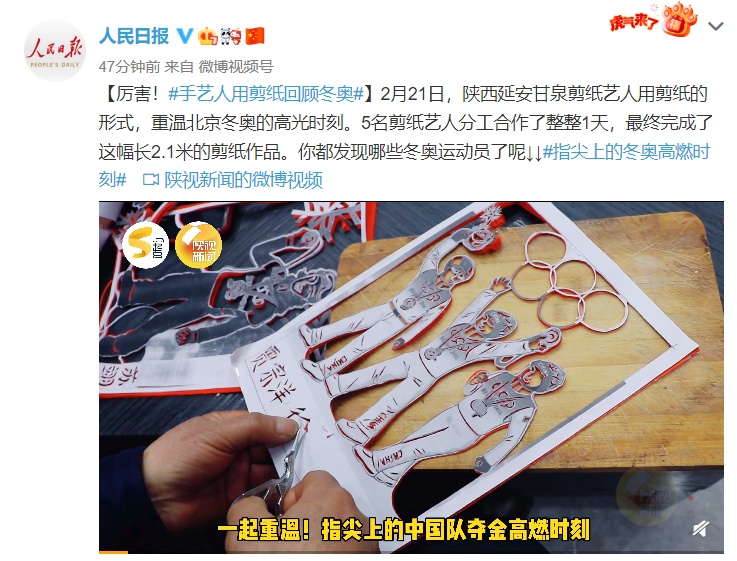 2月21日,陕西延安甘泉剪纸艺人用剪纸的形式,重温北京冬奥的高光时刻。5名剪纸艺人分工合作了整整1天,最终完成了这幅长2.1米的剪纸作品。你都发现哪些冬奥运动员了呢?