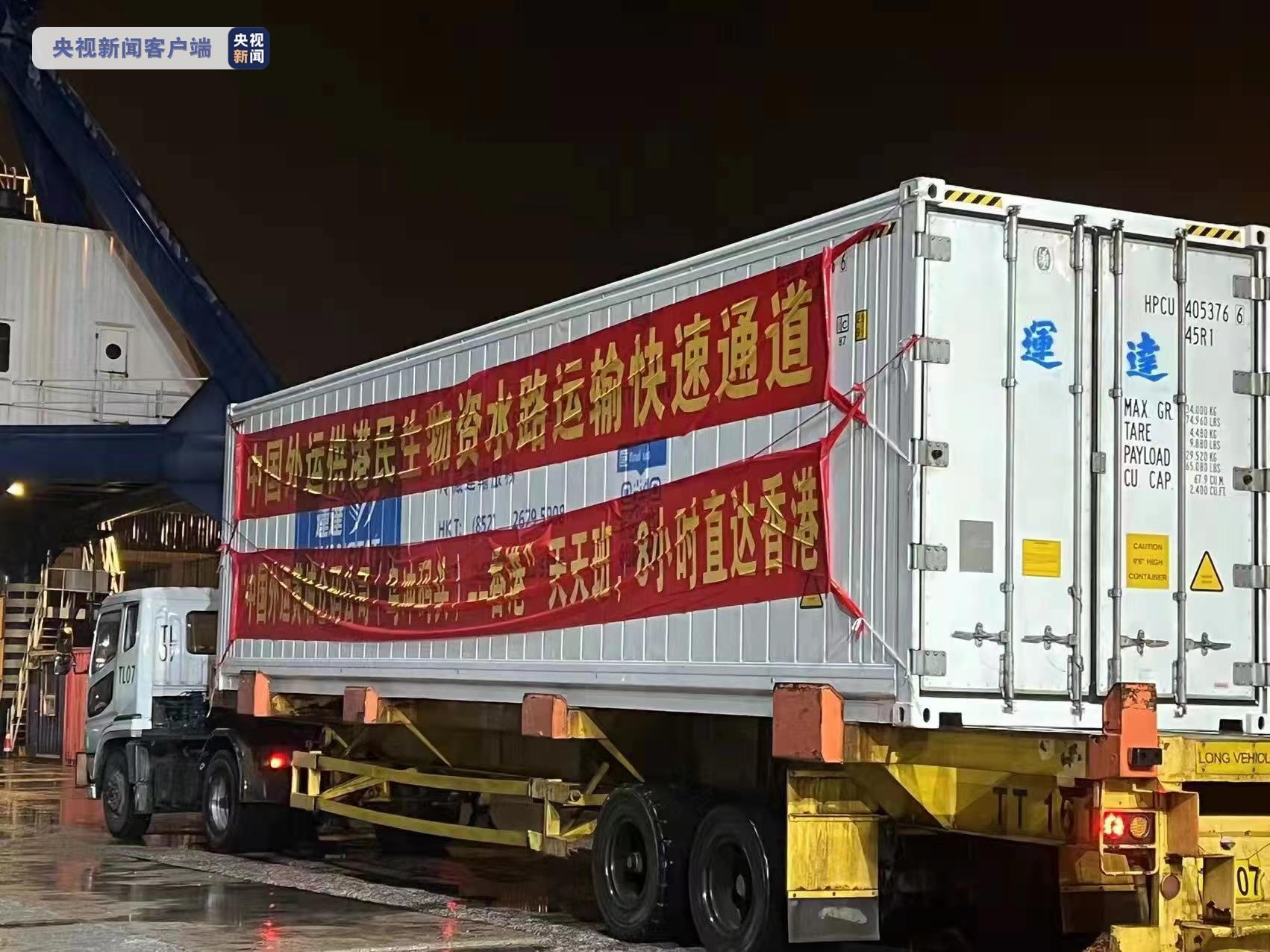 22日晚,一批装载着各类食品等民生物资的集装箱抵达香港屯门的一个码头,该条船上共装有4个20尺集装箱和5个40尺集装箱的供港民生物资。