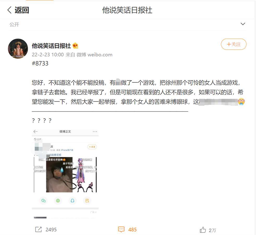 2月23日,微博用户“他说笑话日报社”转发投稿称,有博主用“丰县八孩母亲”的照片制作游戏,用链子套她脖子。视频截图显示,有拿着锁链的动画人物和这位母亲同框出现,锁链被套放在这位母亲的脖子部位。该视频发布于2月11日,弹幕中几乎都在表达对视频的不满。